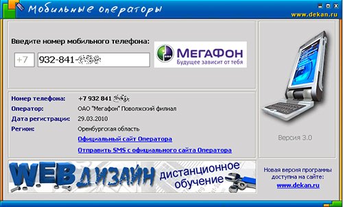(в другой регион) обойдется вам слишком дорого. Кроме того, вы сможете быстро и просто отправить бесплатное СМС на любой номер. Что нового: Версия 3.0: - Добавлены официальные сайты Операторов - Добавлены ссылки на страницы Операторов для бесплатной отправки СМС - Добавлены логотипы Операторов - Обновлена база программы Версия 3.2: - Обновлена база программы (от 14.12.2010)